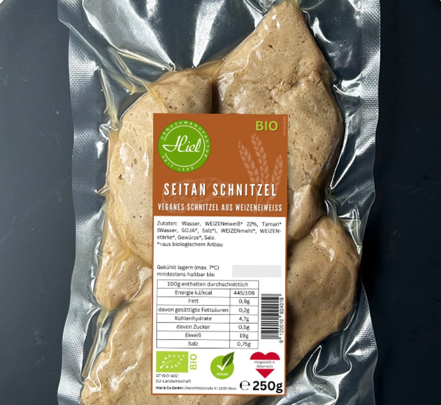 Das Bio Seitan Schnitzel von Hiel ist ein veganes Schnitzel auf Basis von Bio-Weizeneiweiß und Sojasauce, mit ca. 19 g Protein pro 100 g und reduziertem Fettgehalt. Es ist bereits verzehrfertig und lässt sich schnell erhitzen oder anbraten. Enthält Gluten und Soja; kühl lagern bei 2–7 °C.