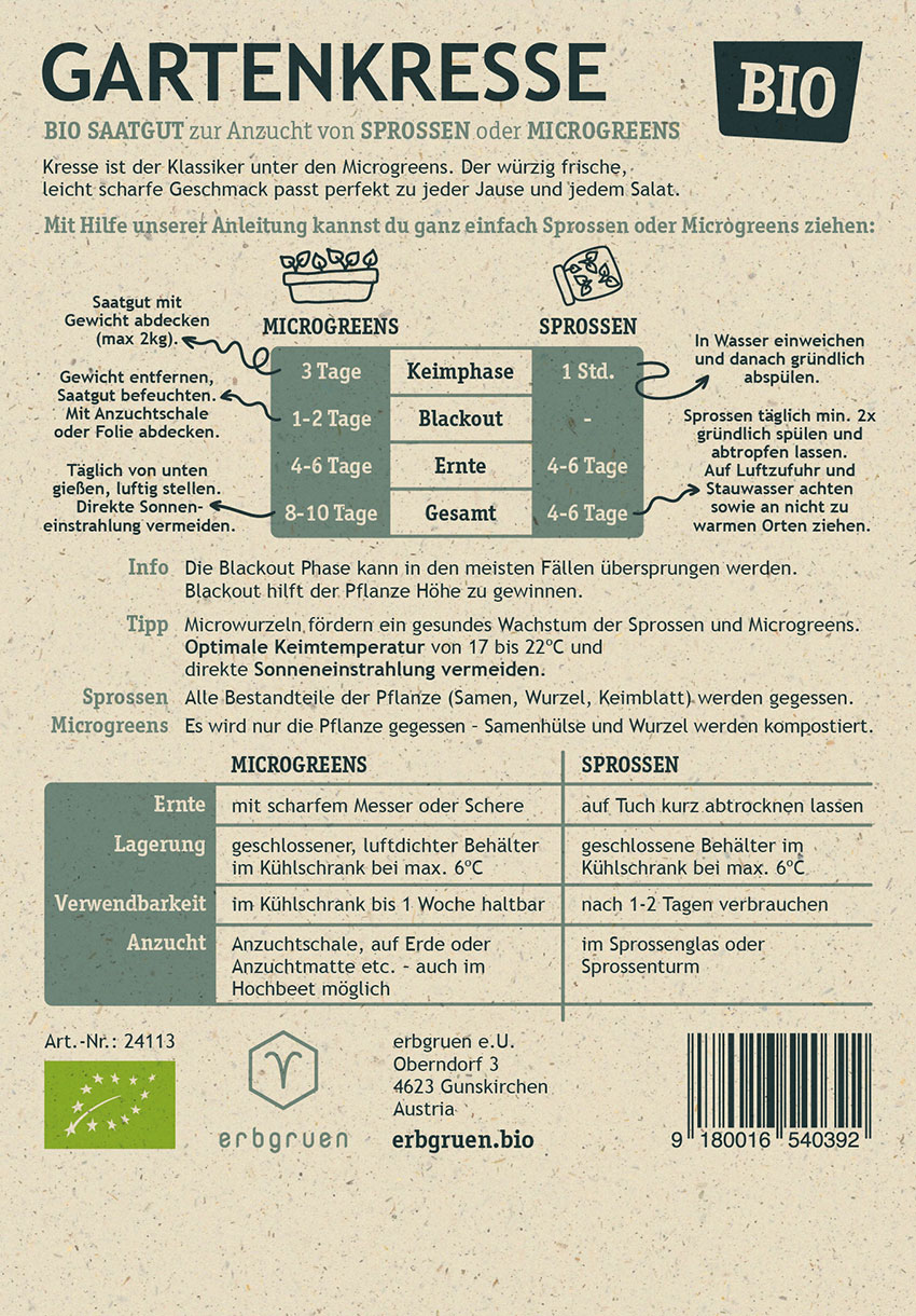 Unsere Gartenkresse Bio-Samen stammen aus kontrolliert biologischem Anbau und sind frei von Chemikalien und Pestiziden. Starten Sie jetzt Ihre eigene Kresse-Anzucht und genießen Sie die frische, würzige Note der selbst gezogenen Microgreens und Sprossen!